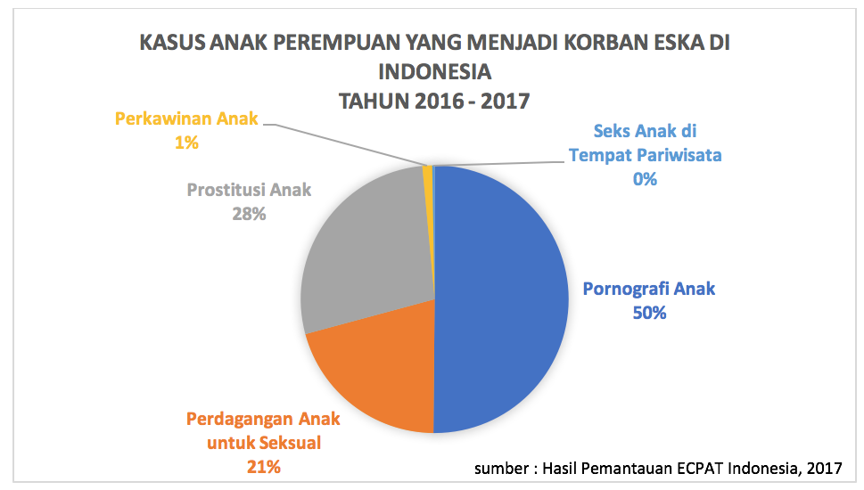 Anak Perempuan masih menjadi kelompok yang paling rentan dalam kasus Eksploitasi Seksual Komersial Anak (ESKA) di Indonesia. Berdasarkan hasil pendataan ECPAT Indonesia sejak September 2016 sampai September 2017, ditemukan 508 anak telah menjadi korban Eksploitasi Seksual Komersial Anak (ESKA) di Indonesia. Mirisnya, 67 persen diantaranya terjadi pada anak perempuan. Dari 339 anak perempuan yang menjadi korban ESKA, 50 persen merupakan kasus pornografi anak, 28 persen kasus prostitusi anak dan 21 persen adalah kasus Perdagangan Anak untuk Tujuan Seksual.